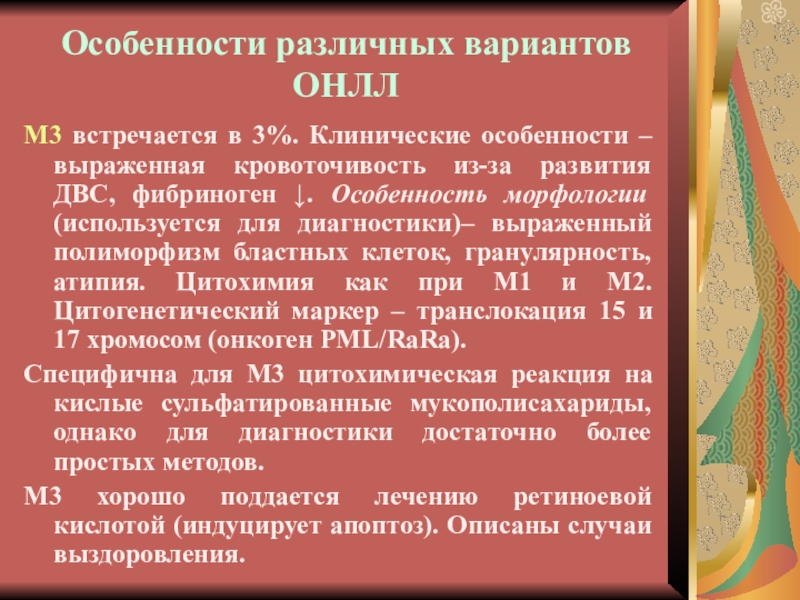 t(15; 17) при МЗ, t(9; 11) при М5а-вариантах ОМЛ, а также выделить цитогенетические субварианты ОМЛ: t(6; 9) при ОМЛ с базофилией, t(8; 16) при М5 с эритрофагоцитозом.