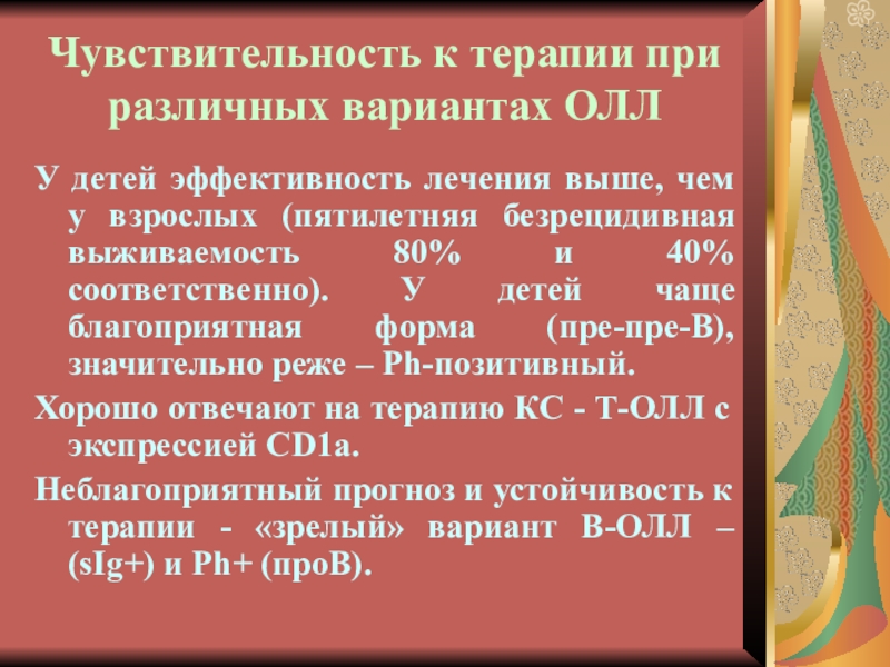 Слайд 34Чувствительность к терапии при различных вариантах ОЛЛ