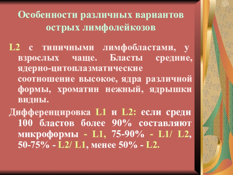 Дифференцировка L1 и L2: если среди 100 бластов более 90% составляют микроформы - L1, 75-90% - L1/ L2, 50-75% - L2/ L1, менее 50% - L2.