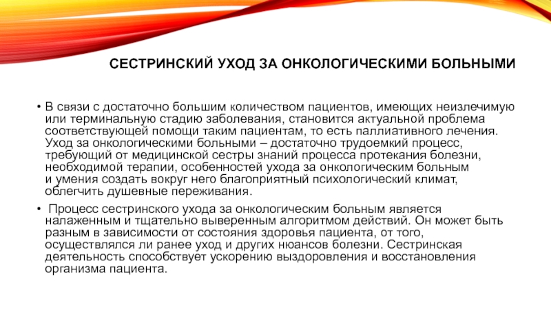 таким пациентам, то есть паллиативного лечения. Уход за онкологическими больными – достаточно трудоемкий процесс, требующий от медицинской сестры знаний процесса протекания болезни, необходимой терапии, особенностей ухода за онкологическим больным и умения создать вокруг него благоприятный психологический климат, облегчить душевные переживания.