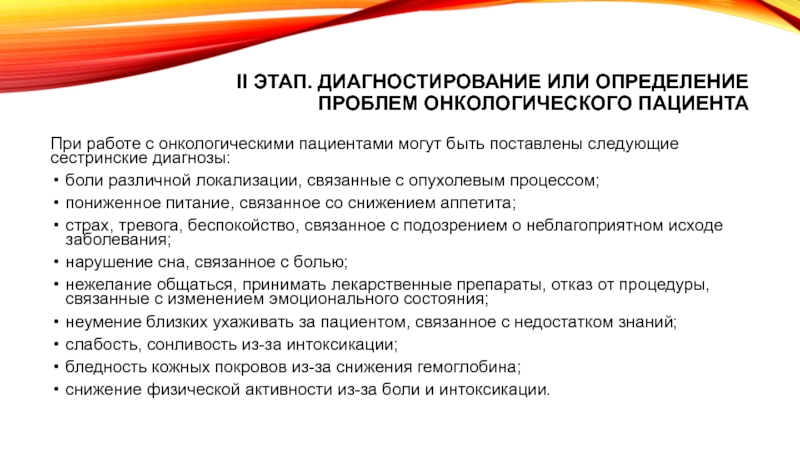 Слайд 7II этап. Диагностирование или определение проблем онкологического пациента