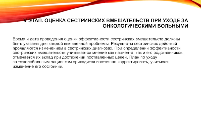 Слайд 12V этап. Оценка сестринских вмешательств при уходе за онкологическими больными