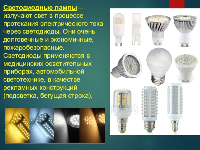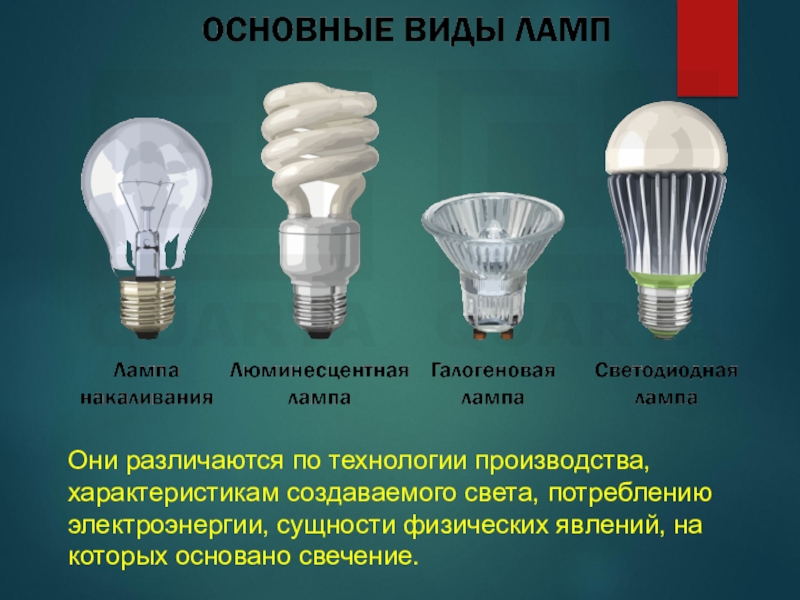 Слайд 7Они различаются по технологии производства, характеристикам создаваемого света, потреблению электроэнергии,