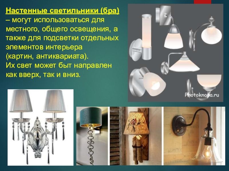 Слайд 19Настенные светильники (бра) – могут использоваться для местного, общего освещения,