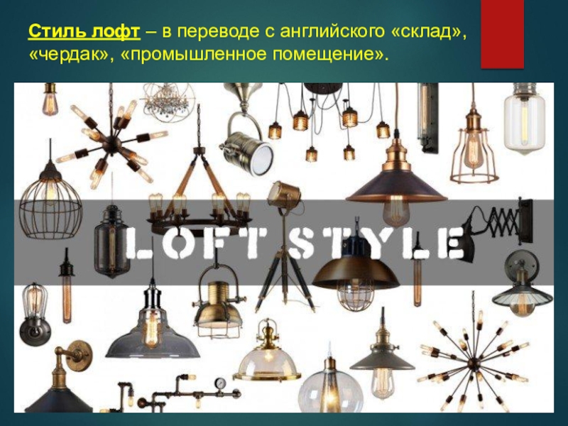 Слайд 65Стиль лофт – в переводе с английского «склад», «чердак», «промышленное