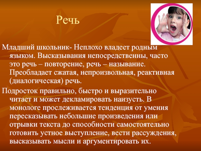 РечьМладший школьник- Неплохо владеет родным языком. Высказывания непосредственны, часто это речь – повторение, речь – называние. Преобладает