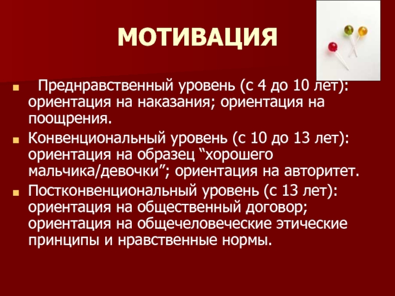 МОТИВАЦИЯ Преднравственный уровень (с 4 до 10 лет): ориентация на наказания; ориентация на поощрения.Конвенциональный уровень (с 10