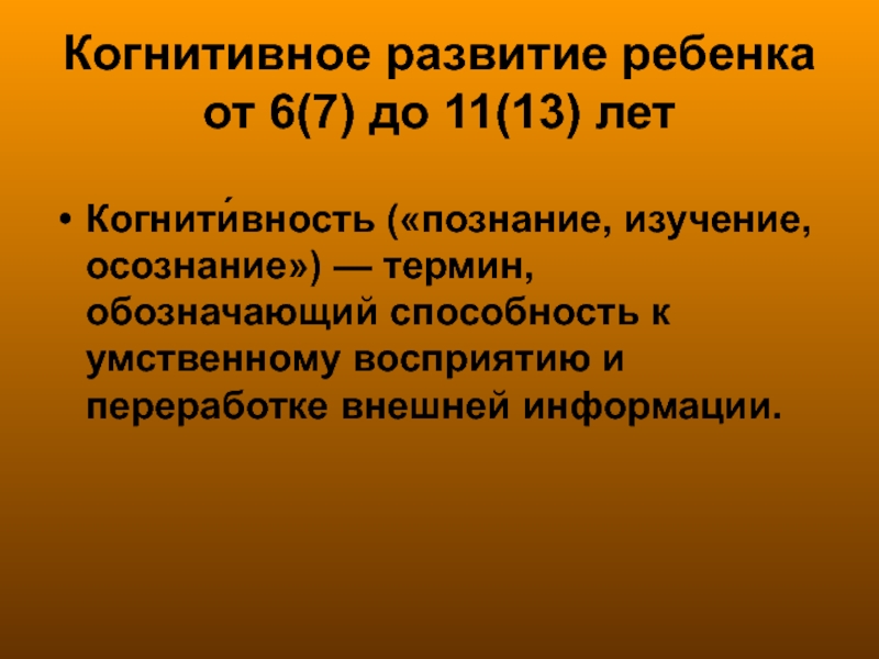 Когнитивное развитие ребенка от 6(7) до 11(13) летКогнити́вность («познание, изучение, осознание») — термин, обозначающий способность к умственному