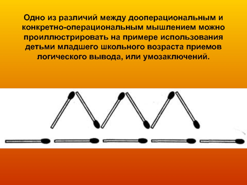Слайд 16Одно из различий между дооперациональным и конкретно-операциональным мышлением можно проиллюстрировать