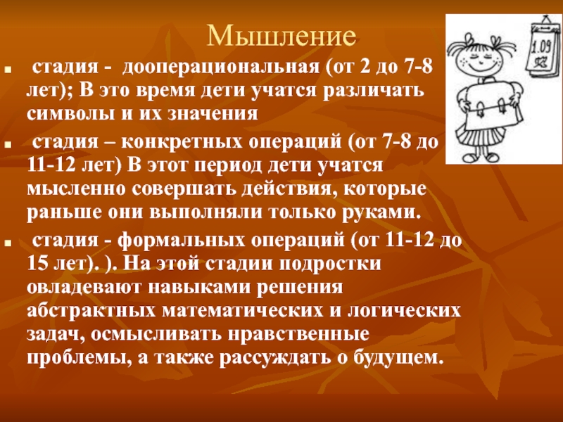 Мышление стадия - дооперациональная (от 2 до 7-8 лет); В это время дети учатся различать символы и
