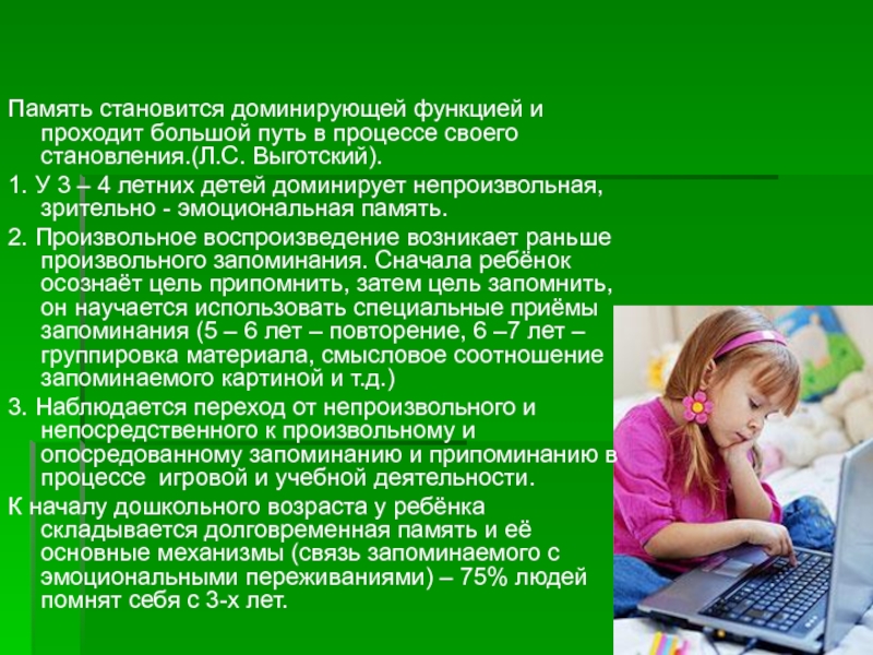 К началу дошкольного возраста у ребёнка складывается долговременная память и её основные механизмы (связь запоминаемого с эмоциональными переживаниями) – 75% людей помнят себя с 3-х лет.