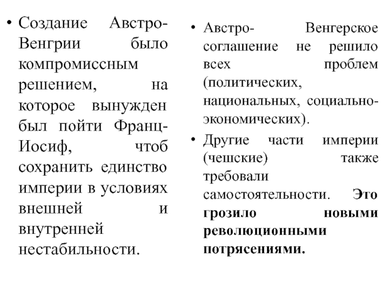 Австро- Венгерское соглашение не решило всех проблем (политических, национальных, социально-экономических).
