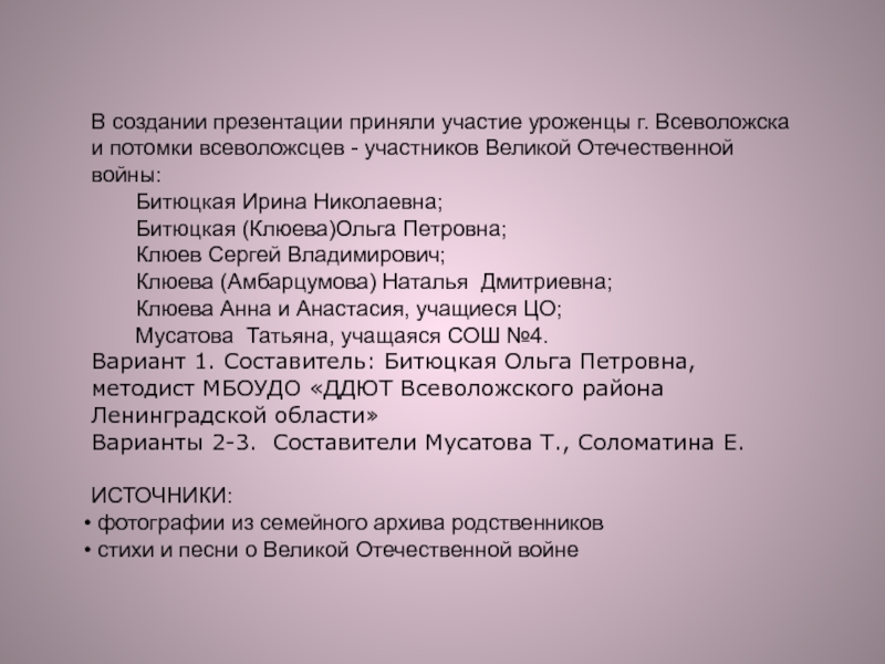 Слайд 16В создании презентации приняли участие уроженцы г. Всеволожска и потомки