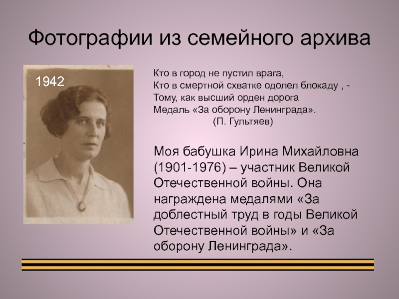 Моя бабушка Ирина Михайловна (1901-1976) – участник Великой Отечественной войны. Она награждена медалями «За доблестный труд в годы Великой Отечественной войны» и «За оборону Ленинграда».