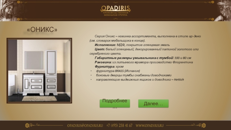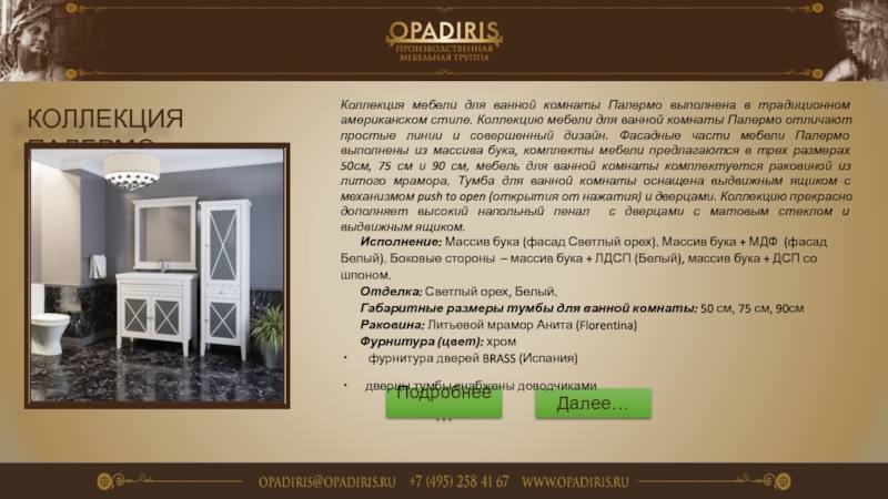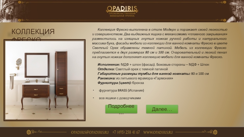 матового стекла, внутри – две стеклянные полки. По центру – два выдвижных ящика со вставками матового стекла. В нижней части – дверка, внутри- полка ДСП.