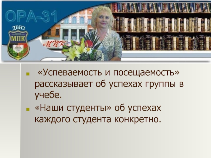 Слайд 28 «Успеваемость и посещаемость» рассказывает об успехах группы в учебе.