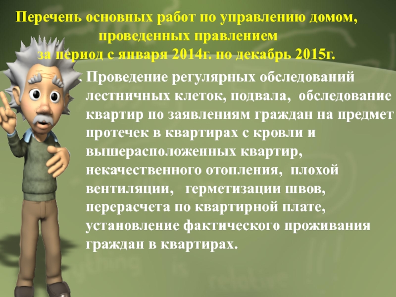 Слайд 109. Проведение регулярных обследований лестничных клеток, подвала, обследование квартир по