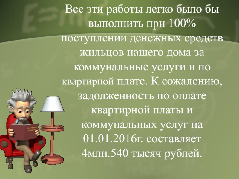 квартирной плате. К сожалению, задолженность по оплате квартирной платы и коммунальных услуг на 01.01.2016г. составляет 4млн.540 тысяч рублей.