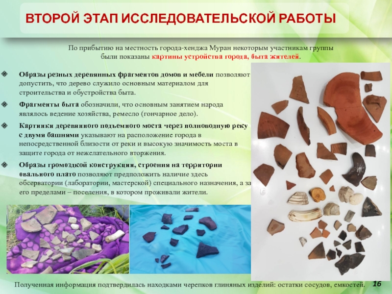 Полученная информация подтвердилась находками черепков глиняных изделий: остатки сосудов, емкостей.