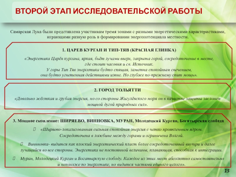 Самарская Лука были представлена участникам тремя зонами с разными энергетическими характеристиками, играющими разную роль в формировании энергопотенциала местности.