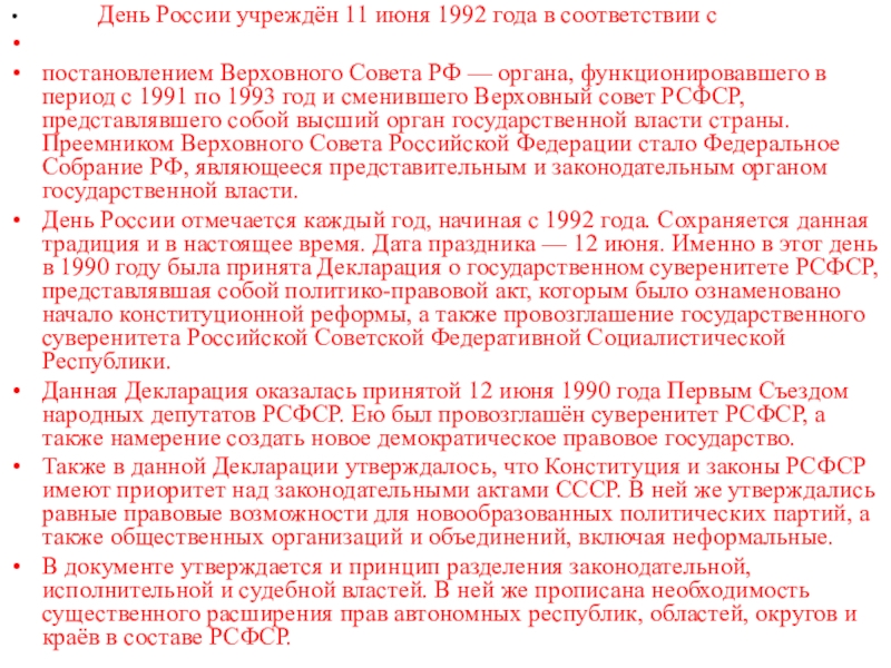 1991 по 1993 год и сменившего Верховный совет РСФСР, представлявшего собой высший орган государственной власти страны. Преемником Верховного Совета Российской Федерации стало Федеральное Собрание РФ, являющееся представительным и законодательным органом государственной власти.День России отмечается каждый год, начиная с 1992 года. Сохраняется данная традиция и в настоящее время. Дата праздника — 12 июня. Именно в этот день в 1990 году была принята Декларация о государственном суверенитете РСФСР, представлявшая собой политико-правовой акт, которым было ознаменовано начало конституционной реформы, а также провозглашение государственного суверенитета Российской Советской Федеративной Социалистической Республики.