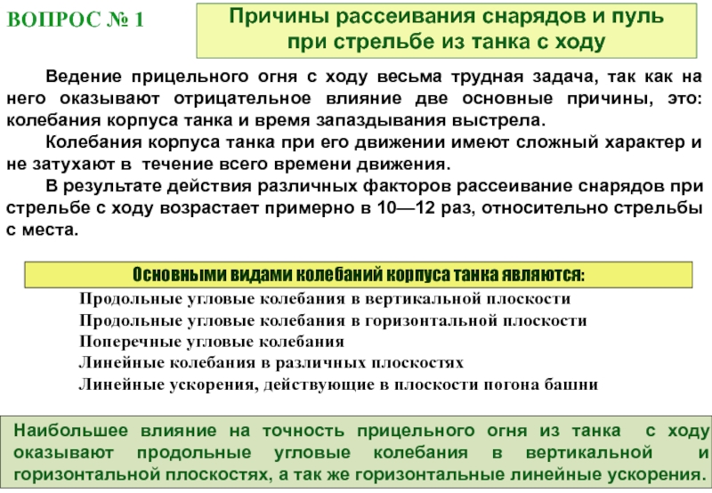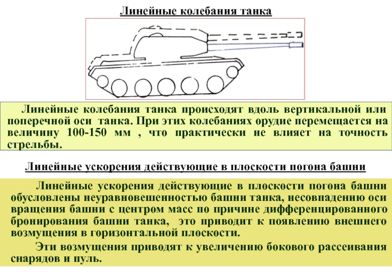 Наибольшее влияние на точность прицельного огня из танка с ходу оказывают продольные угловые колебания в вертикальной и горизонтальной плоскостях, а так же горизонтальные линейные ускорения.