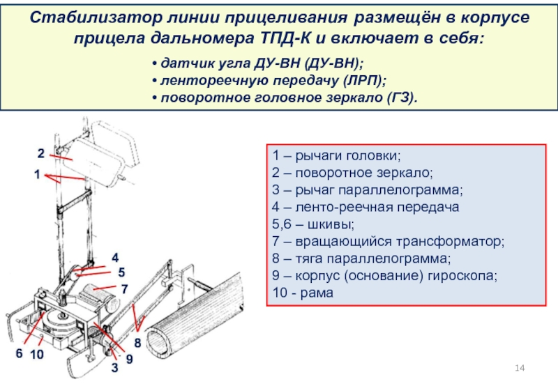 Стабилизатор линии прицеливания размещён в корпусе прицела дальномера ТПД-К и включает в себя: