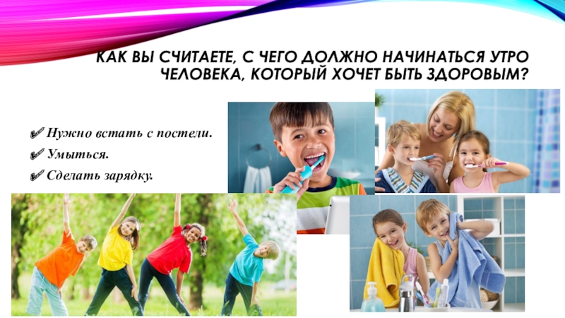 Слайд 5Как вы считаете, с чего должно начинаться утро человека, который