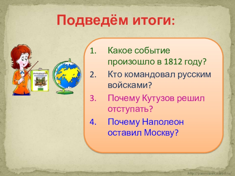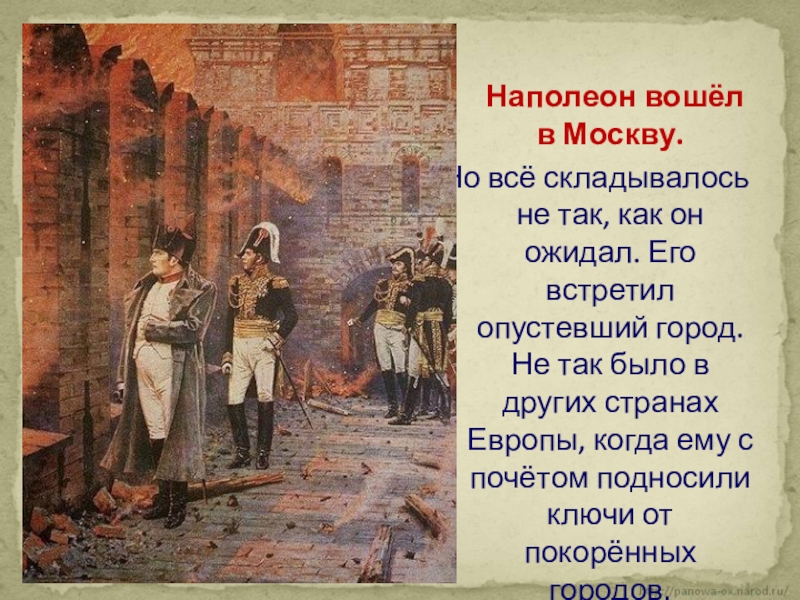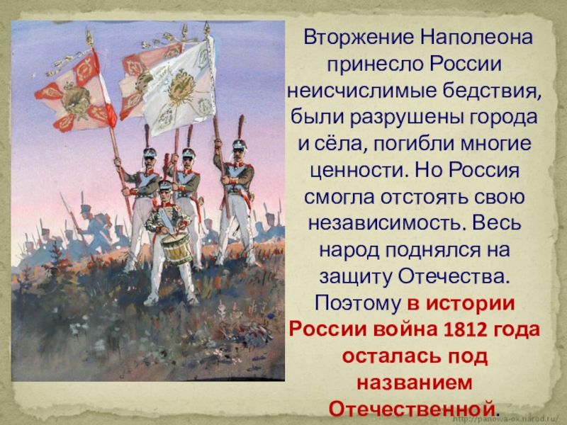 Слайд 21 Вторжение Наполеона принесло России неисчислимые бедствия, были разрушены города и