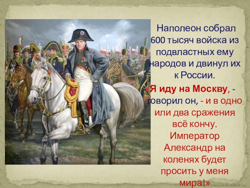 Слайд 5 Наполеон собрал 600 тысяч войска из подвластных ему народов и