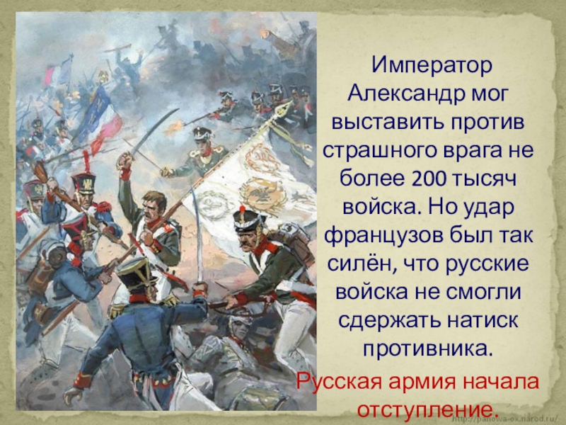 Слайд 7 Император Александр мог выставить против страшного врага не более 200