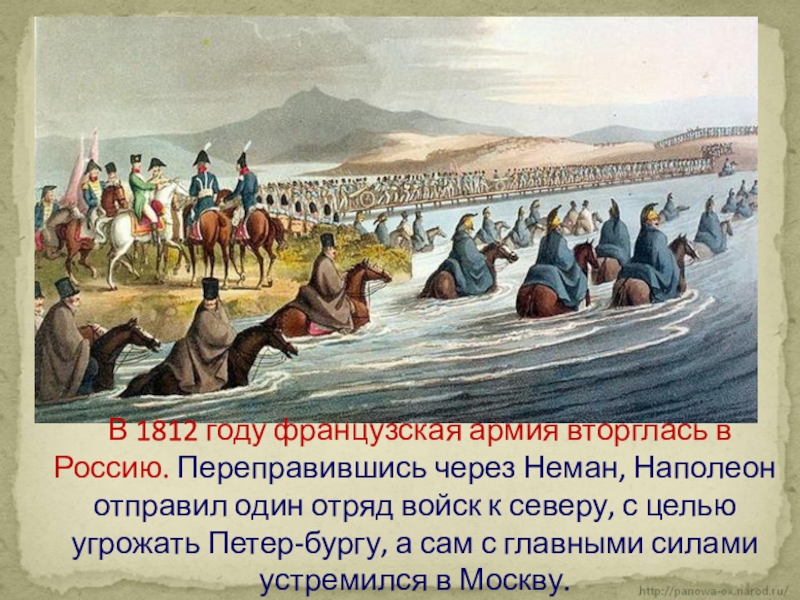 Слайд 6 В 1812 году французская армия вторглась в Россию. Переправившись через