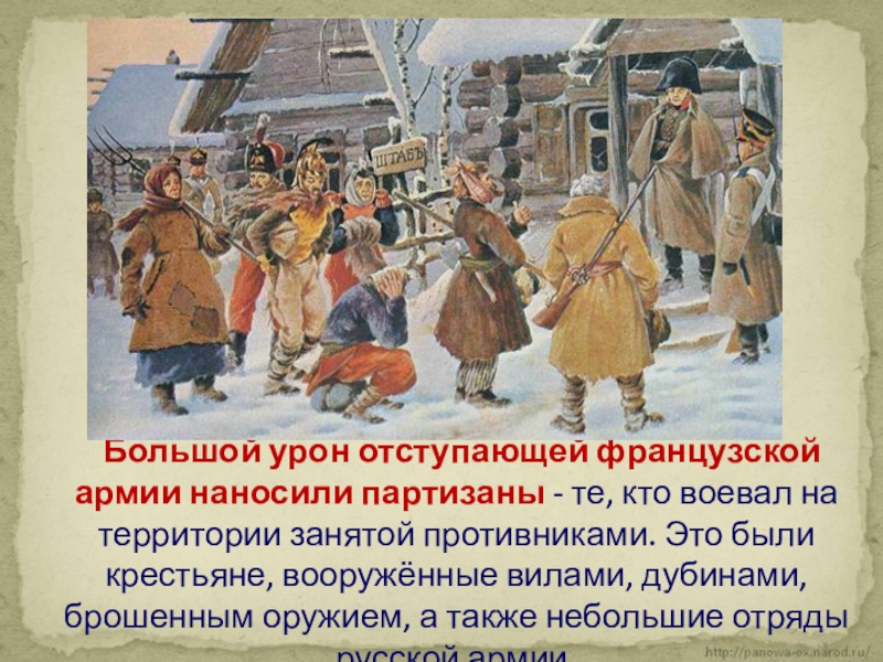 Слайд 18 Большой урон отступающей французской армии наносили партизаны - те, кто