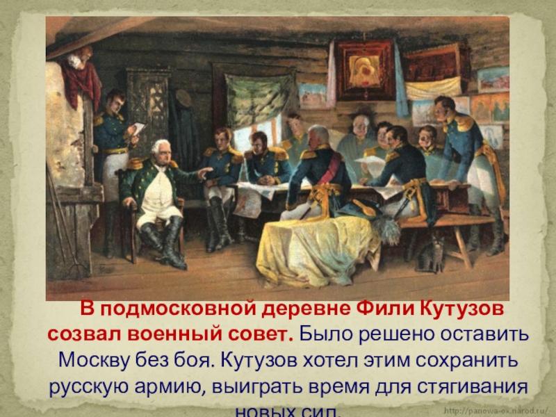 В подмосковной деревне Фили Кутузов созвал военный совет. Было