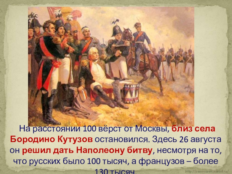 Слайд 13 На расстоянии 100 вёрст от Москвы, близ села Бородино Кутузов