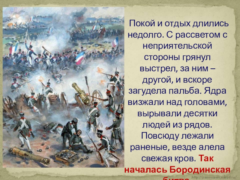 Ядра визжали над головами, вырывали десятки людей из рядов. Повсюду лежали раненые, везде алела свежая кров. Так началась Бородинская битва.