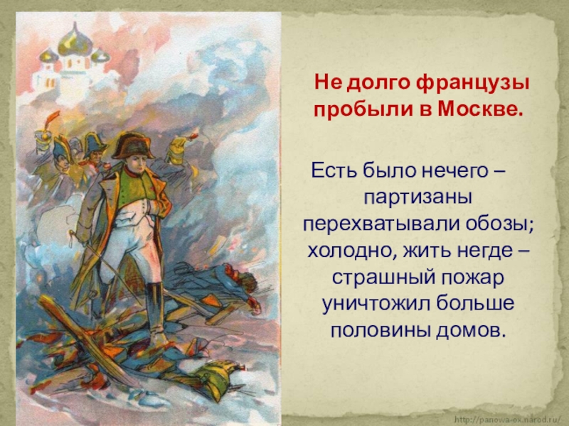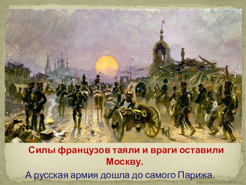 Слайд 20 Силы французов таяли и враги оставили Москву.