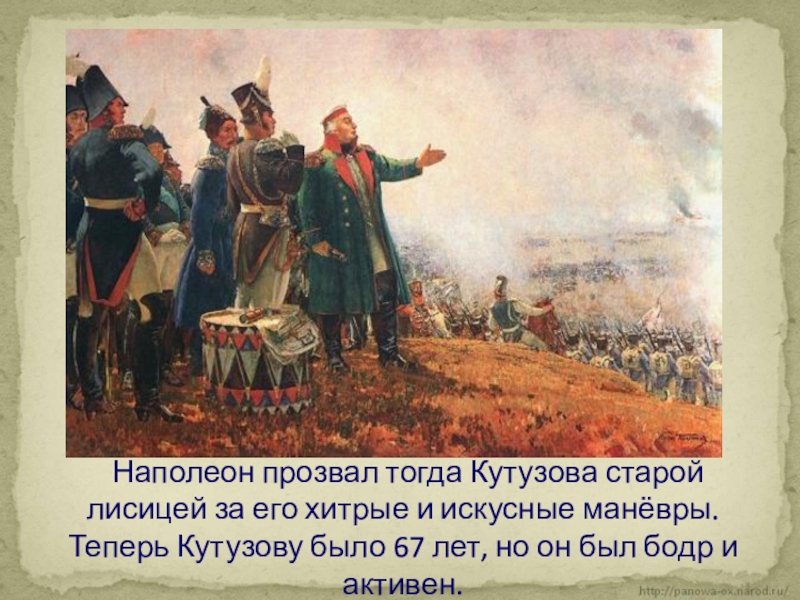 Слайд 11 Наполеон прозвал тогда Кутузова старой лисицей за его хитрые и