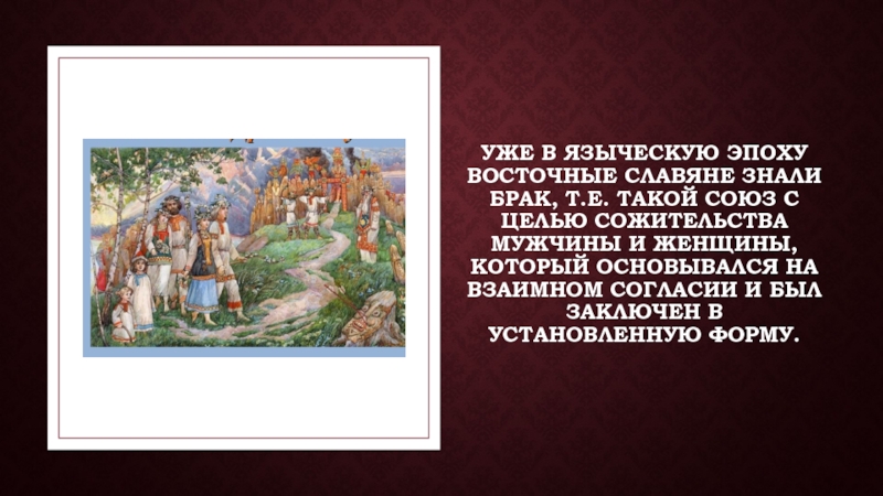 Слайд 2Уже в языческую эпоху восточные славяне знали брак, т.е. такой