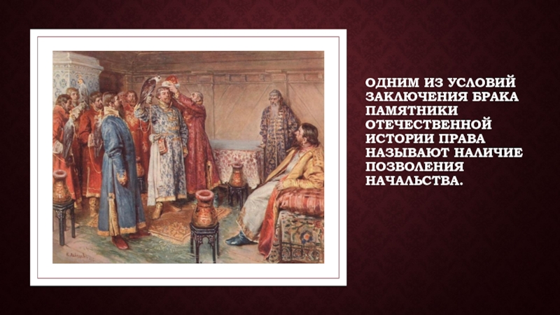 Слайд 12Одним из условий заключения брака памятники отечественной истории права называют