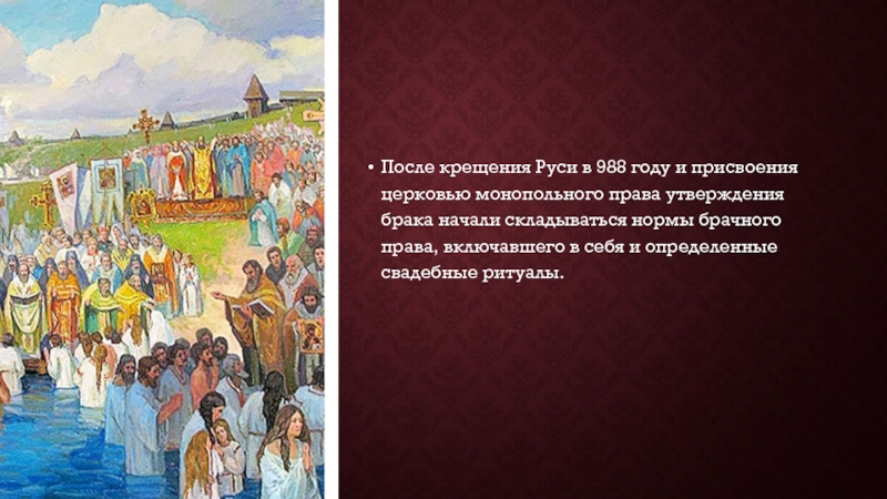 После крещения Руси в 988 году и присвоения церковью монопольного права утверждения брака начали складываться нормы брачного