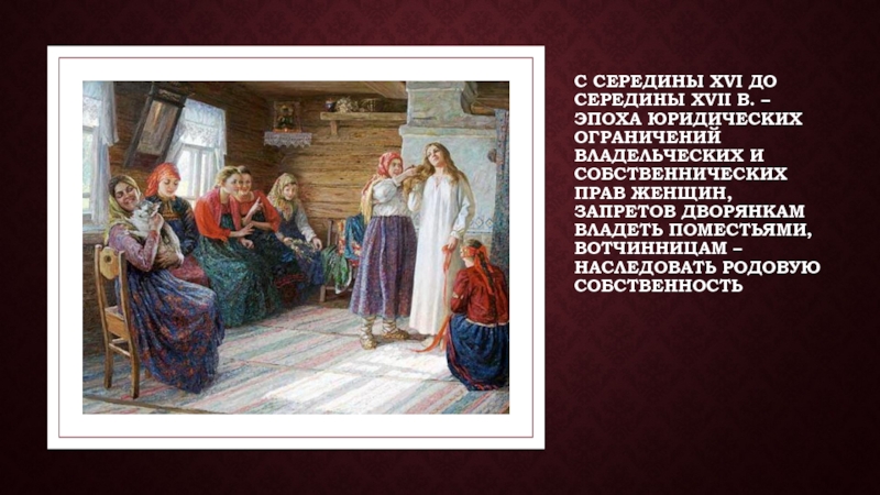С середины XVI до середины XVII в. – эпоха юридических ограничений владельческих и собственнических прав женщин, запретов дворянкам