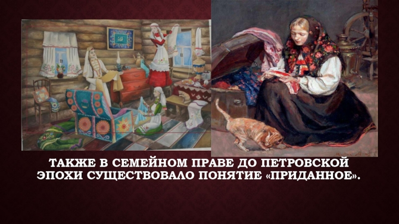 Слайд 17Также в семейном праве до петровской эпохи существовало понятие «приданное».