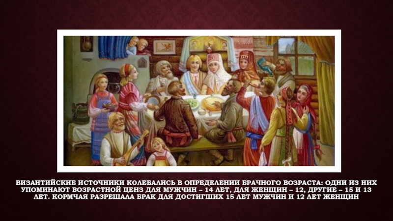 Слайд 5Византийские источники колебались в определении брачного возраста: одни из них