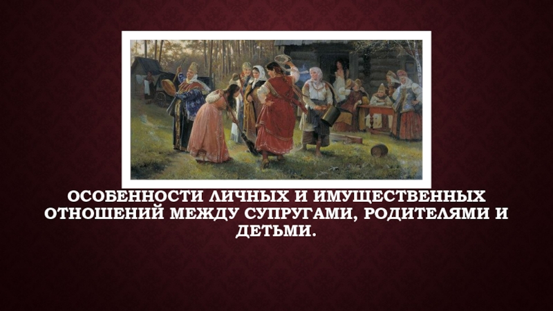 Слайд 15Особенности личных и имущественных отношений между супругами, родителями и детьми.