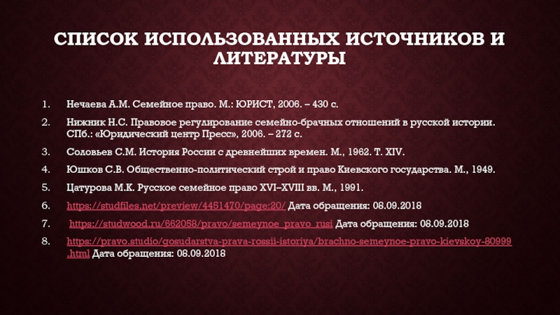 Список использованных источников и литературы Нечаева А.М. Семейное право. М.: ЮРИСТ, 2006. – 430 с.Нижник Н.С. Правовое регулирование семейно-брачных отношений в русской