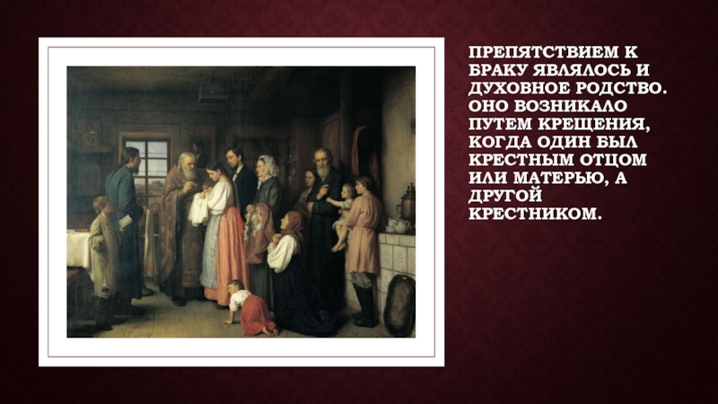 Слайд 7Препятствием к браку являлось и духовное родство. Оно возникало путем