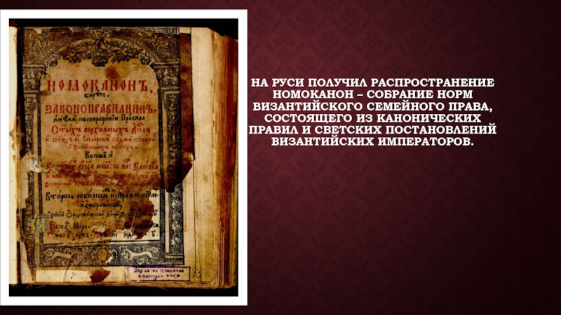 Слайд 4На Руси получил распространение Номоканон – собрание норм византийского семейного