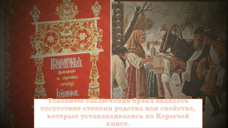 Условием заключения брака являлось отсутствие степени родства или свойства, которые устанавливались по Кормчей книге.
