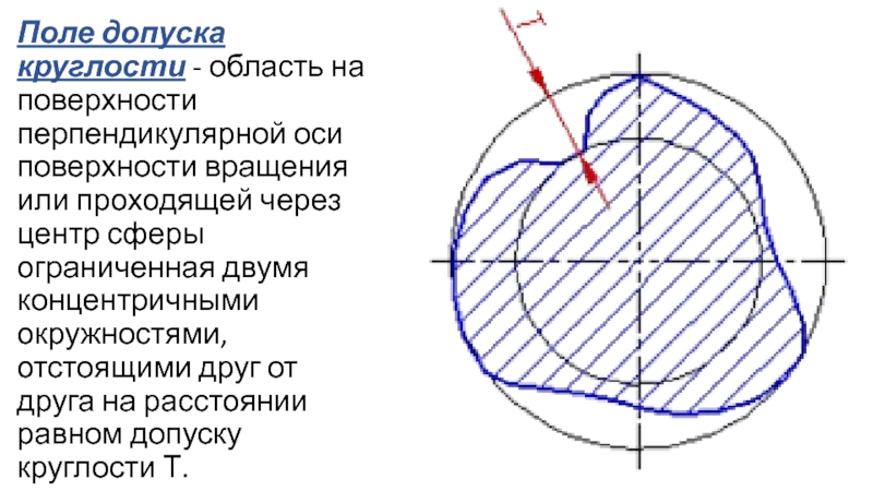Слайд 12Поле допуска круглости - область на поверхности перпендикулярной оси поверхности вращения